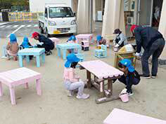 ままごと遊びなど外で使う机、椅子をペンキで塗り替えました。子どもたちもペンキまみれになりながらも真剣に作業して、綺麗な道具になりました。